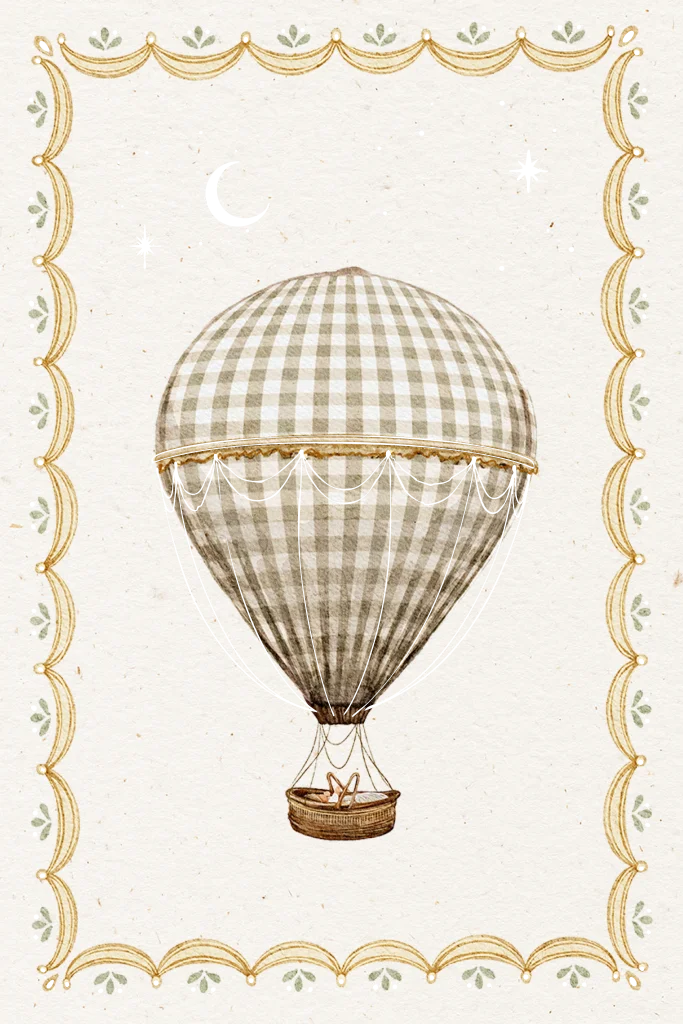 Een prachtige poster voor een kinderkamer. Op een achtergrond van beige papier is een luchtballon getekend met groene ruitjes. Aan de buitenrand staat een getekende border met goudfolie stipjes en goud en groene kleuren. De touwtjes van de ballon worden ook in goudfolie gedrukt. Je kunt de poster met en zonder naam bestellen.| Totaalprijs: 0 |