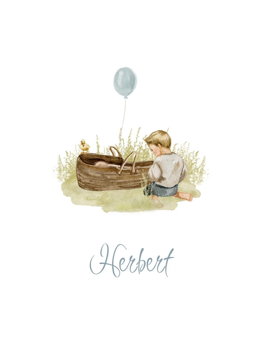 Deze lente poster is perfect voor de geboorte van een broertje. De illustratie toont een baby met een blauwe ballon, ideaal voor een lentekindje. Pas de tekst aan om het persoonlijk te maken voor jullie kleine wonder!
