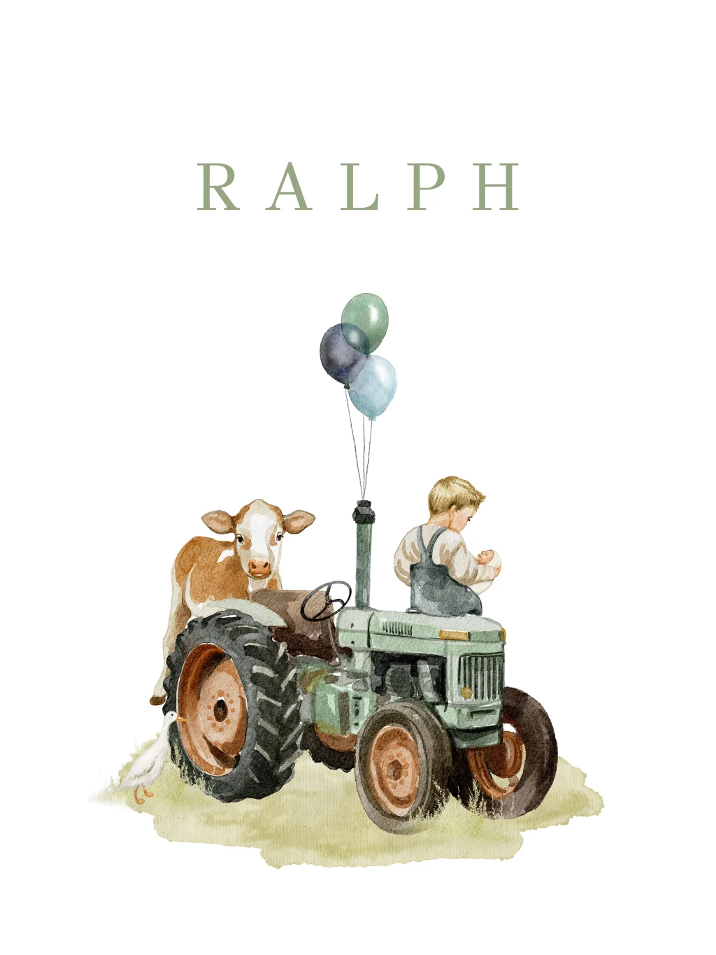 Breng de warme en landelijke sfeer van de boerderij in huis met deze prachtige geboorteposter. Het ontwerp toont een vrolijke boerderijsfeer met een tractor, een nieuwsgierige koe en een trotse grote broer die samen met zijn babybroertje de hoofdrol speelt. Een liefdevolle illustratie die perfect past bij een gezin dat houdt van het buitenleven en de charme van het platteland.