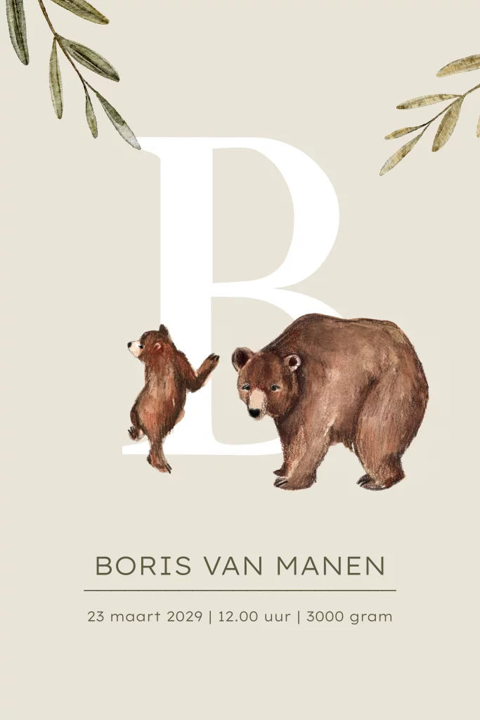 Stoere geboorte poster met een initiaal en getekende beren. Deze poster kan je zelf personaliseren.