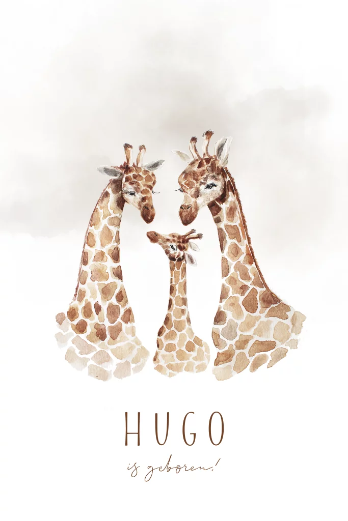 Een poster voor een geboorte van een jongen of meisje met een familie van getekende giraffen. Pas de naam zelf aan in onze editor, of verwijder de tekst als je alleen de illustratie wil laten afdrukken.