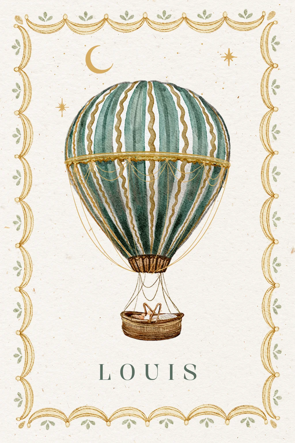 Een prachtige poster voor een kinderkamer. Op een achtergrond van beige papier is een luchtballon getekend met groene strepen, een maan en sterren. Aan de buitenrand staat een getekende border met gele stipjes en groene kleuren. Je kunt de poster met en zonder naam bestellen.