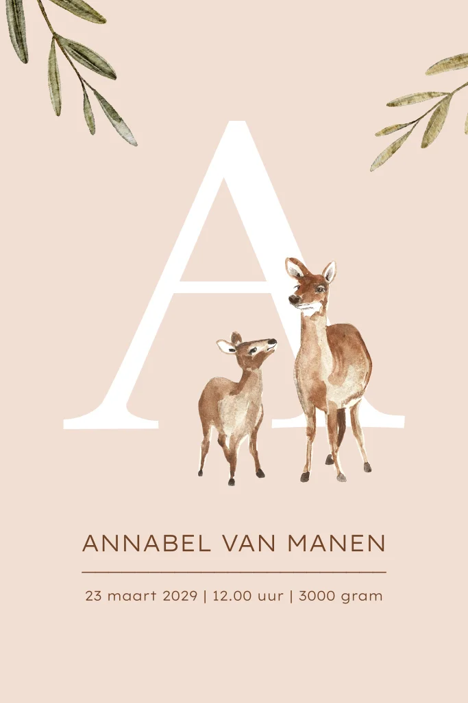 Roze poster met een grote initiaal op de achtergrond. Daarvoor staan 2 hertjes en groene takjes aan de zijkanten.