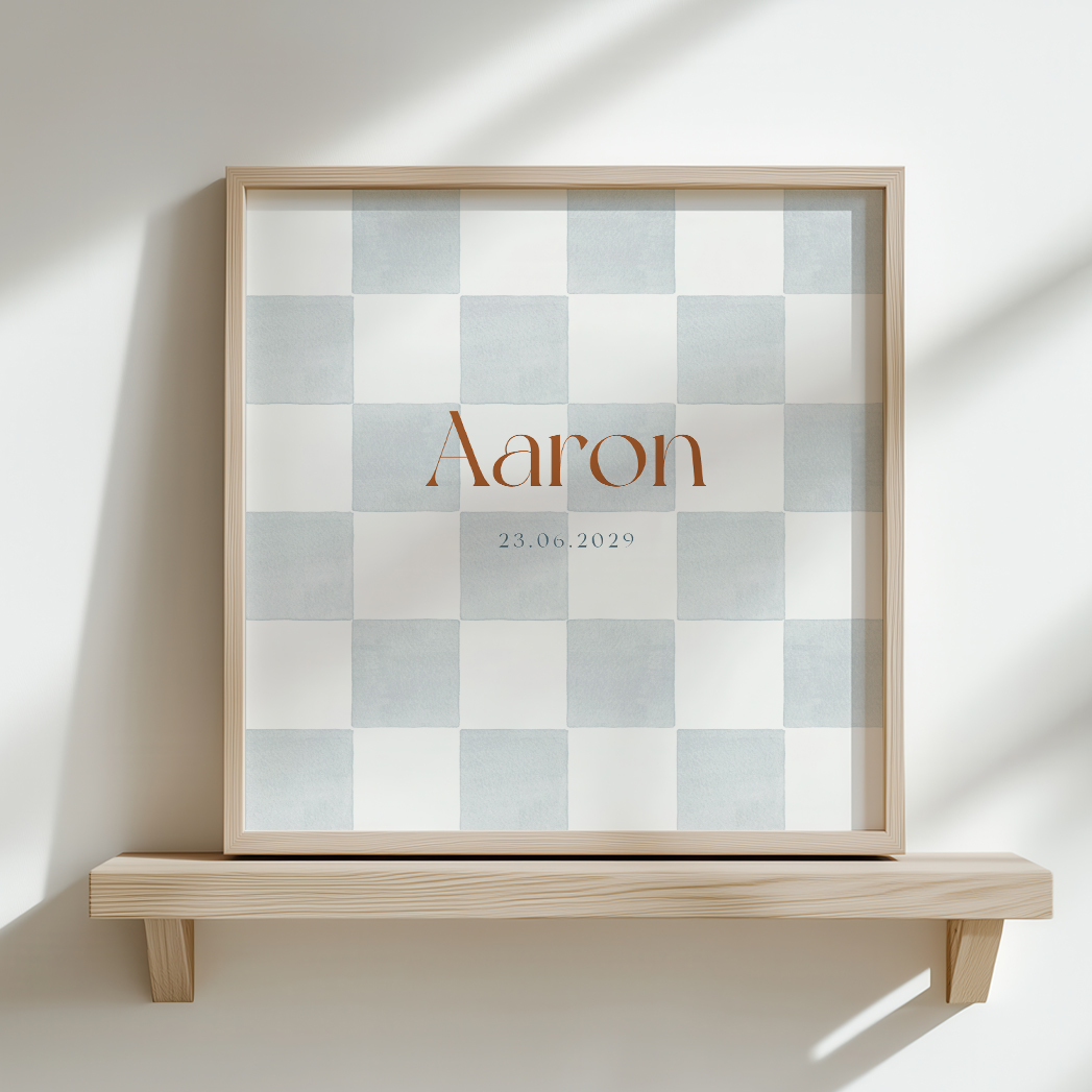 Vierkante poster voor jongens met speels blauw blokjespatroon. Hoogwaardige print op stevig papier — perfect voor de kinderkamer of als kraamcadeau. Personaliseer met naam of geboortedatum.