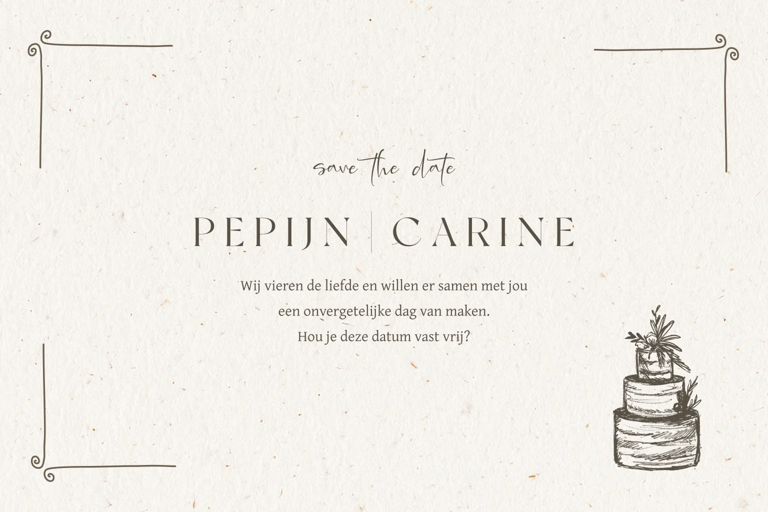 Een mooie getekende save the date kaart. Op een achtergrond van een beige papierlook staat een pentekening van een bruidstaart. Je kunt de illustratie ook vervangen door andere pentekeningen of de kleuren aanpassen.