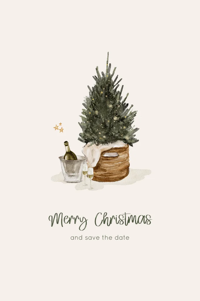 Getekende kerst save the date kaart met een mooie illustratie van een kerstboom met champagne ernaast. Zo nodig je je vrienden vast uit voor jullie huwelijk én wens je ze fijne feestdagen toe.