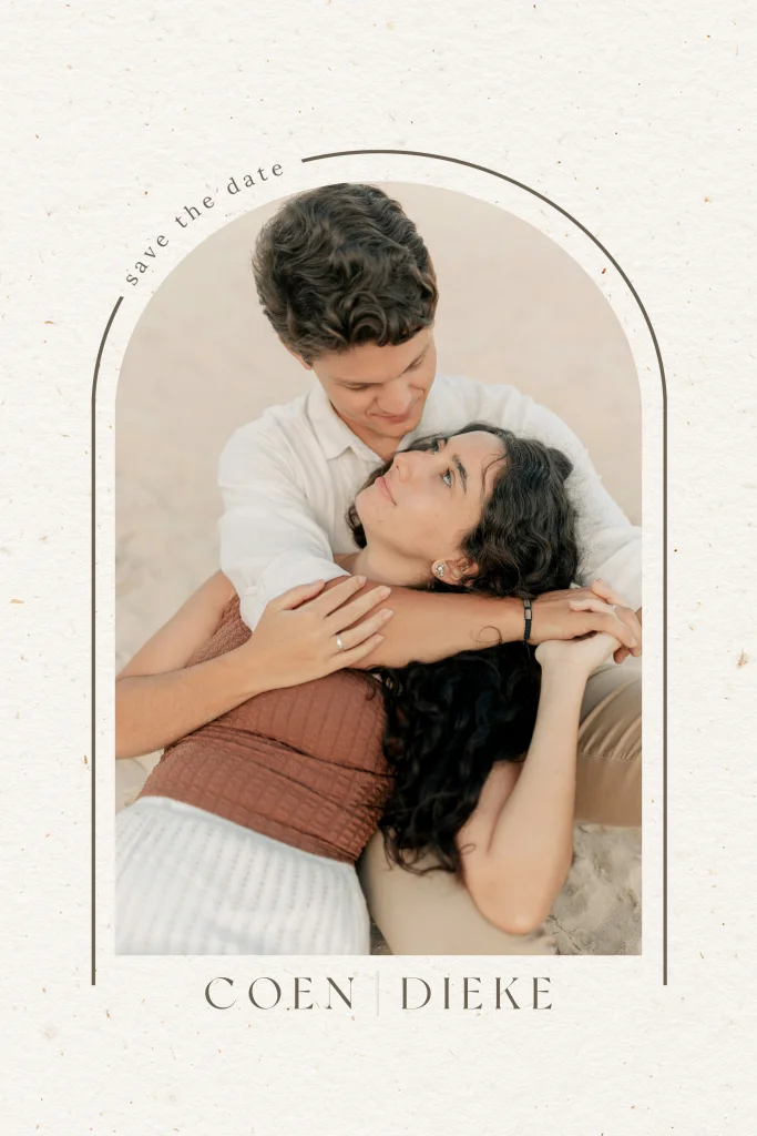 Gaan jullie binnenkort trouwen? Dan is dit een mooie uitnodiging om te versturen. Deze save the date kaart heeft een ovale vorm waar je een foto in kunt plaatsen. De tekst wordt in een boogvorm geschreven en daarin staat save the date. Maak je kaart extra persoonlijk door gebruik te maken van een eigen foto.