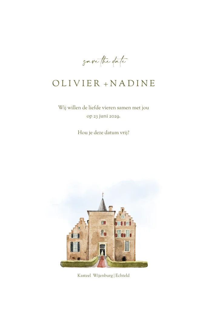 Save the datekaart met een trouwlocatie. OP deze kaart staat kasteel Wijenburg in Echteld. De illustratie is in waterverf getekend door ons.| Totaalprijs: 0 |