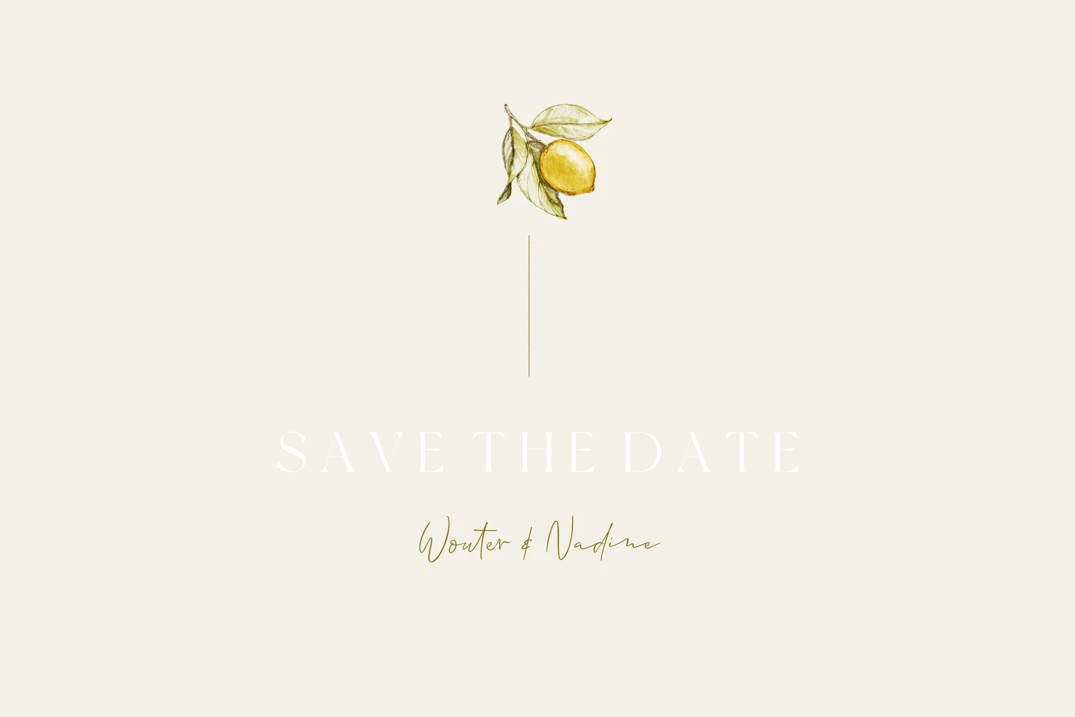Een mooie getekende save the date kaart. Op een beige achtergrond staat een illustratie van citroenen. Een populair thema voor bruiloften.| Totaalprijs: 0 |
