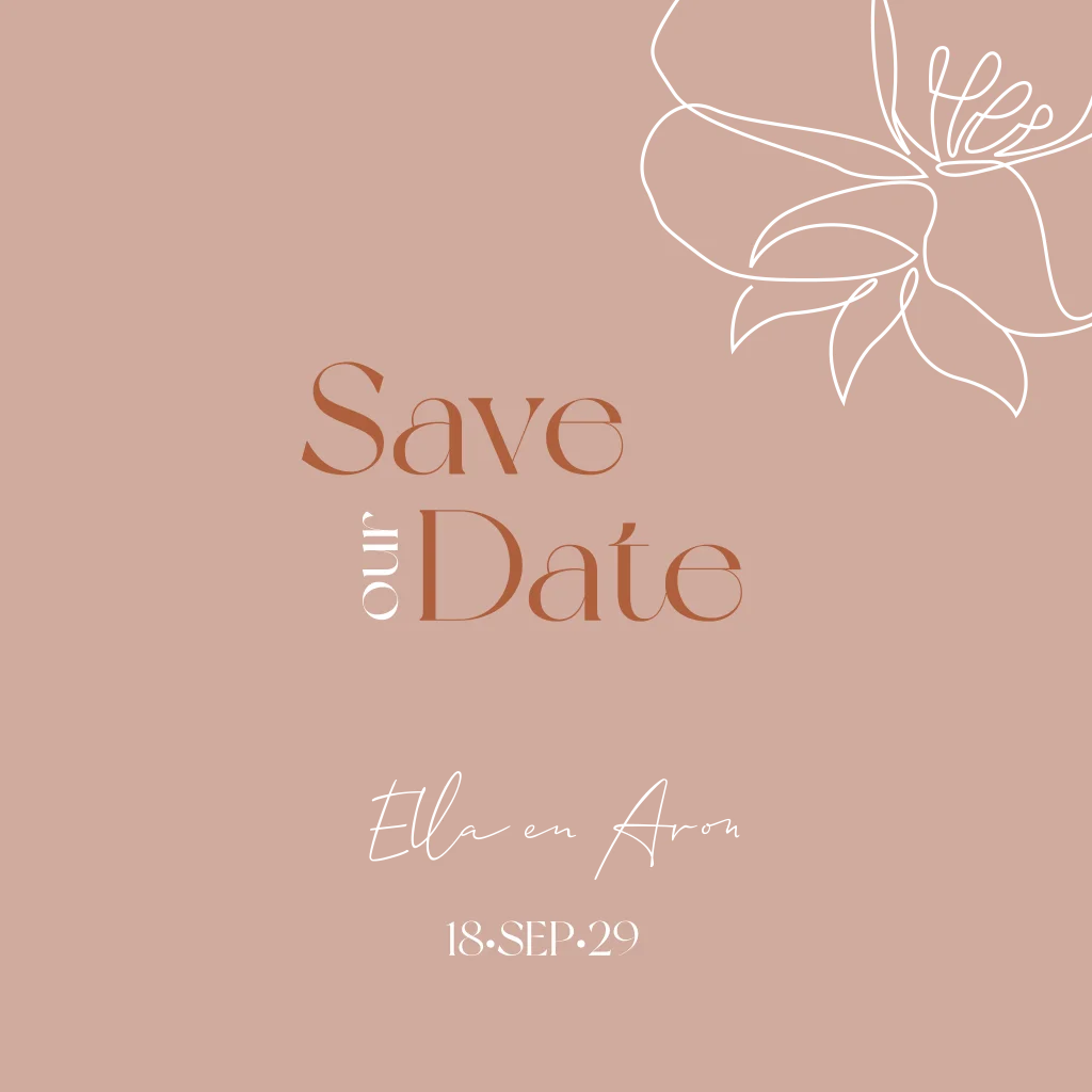 Vierkante save the date kaart met oudroze achtergrond. Daarop een lijntekening van een bloem in goudfolie. Bij deze kaart hoort ook een trouwkaart in dezelfde stijl.