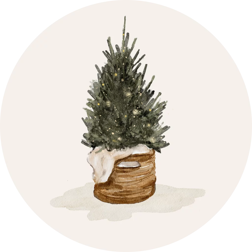 Leuke sluitsticker voor de envelop van jullie kerstkaart met een kerstboom in een mand.