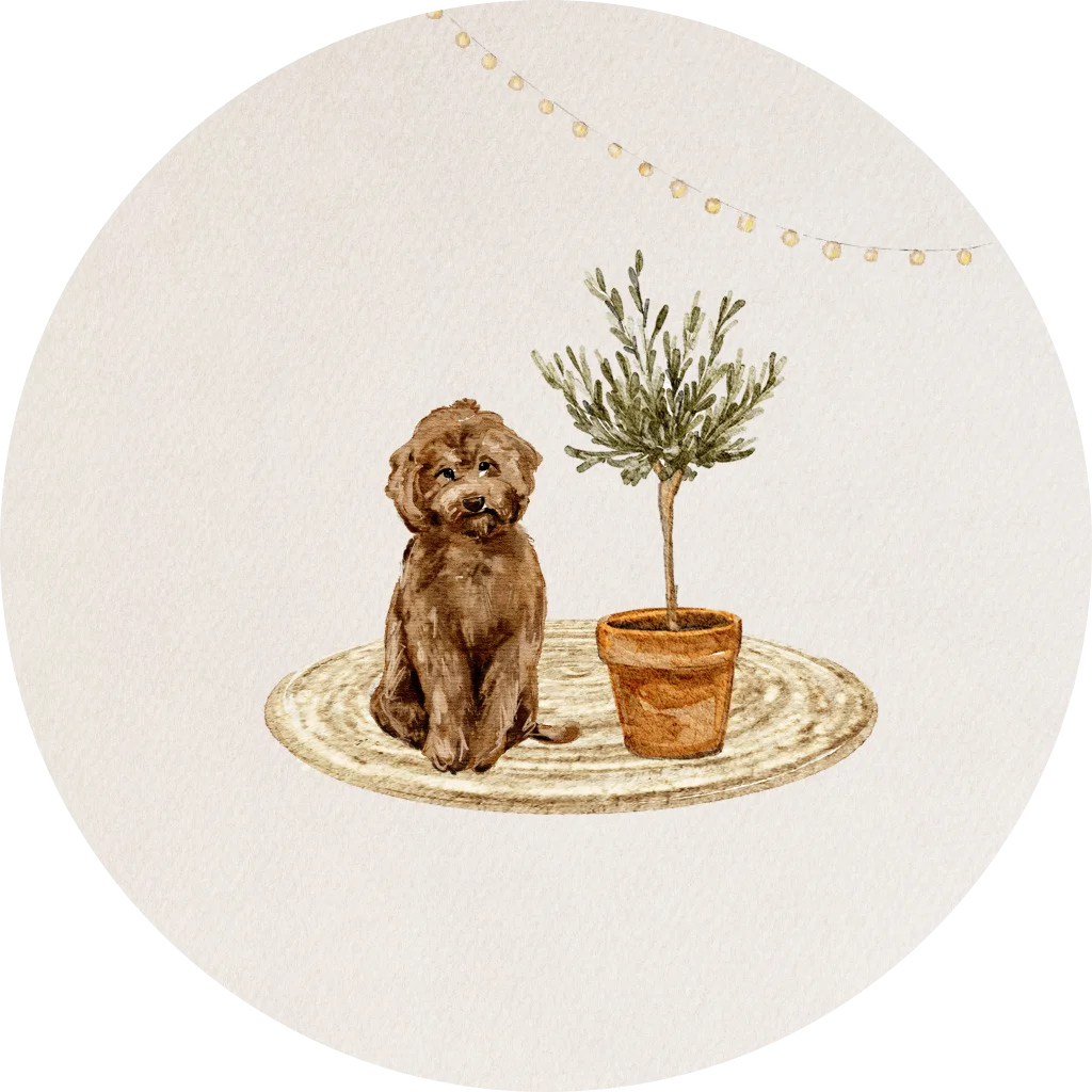 Sluitzegel voor bij je kerstkaart met een labradoodle bij een olijfboom. We hebben verschillende hondjes in onze beeldbank staan, heb je dus geen labradoodle? Bekijk onze beeldbank voor alle andere rassen die wij al hebben getekend. We tekenen ook huisdieren op maat, stuur ons een mailtje mocht je hier meer informatie over willen hebben.