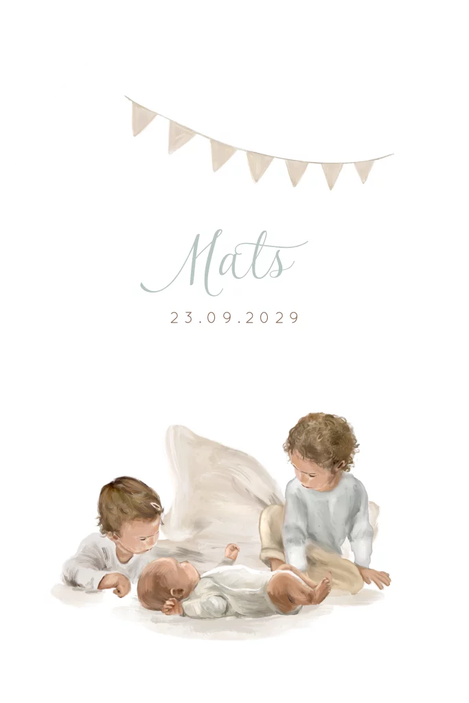 Prachtig geïllustreerd geboortekaartje voor een derde kindje. De illustratie van groter broer en zusje bij het baby broertje is zo vertederend en lief. Dit kaartje heeft een boogvorm, dit maakt het helemaal uniek. Met de vrolijke vlaggen lijn is het feestje van de geboorte van jullie jongen compleet.