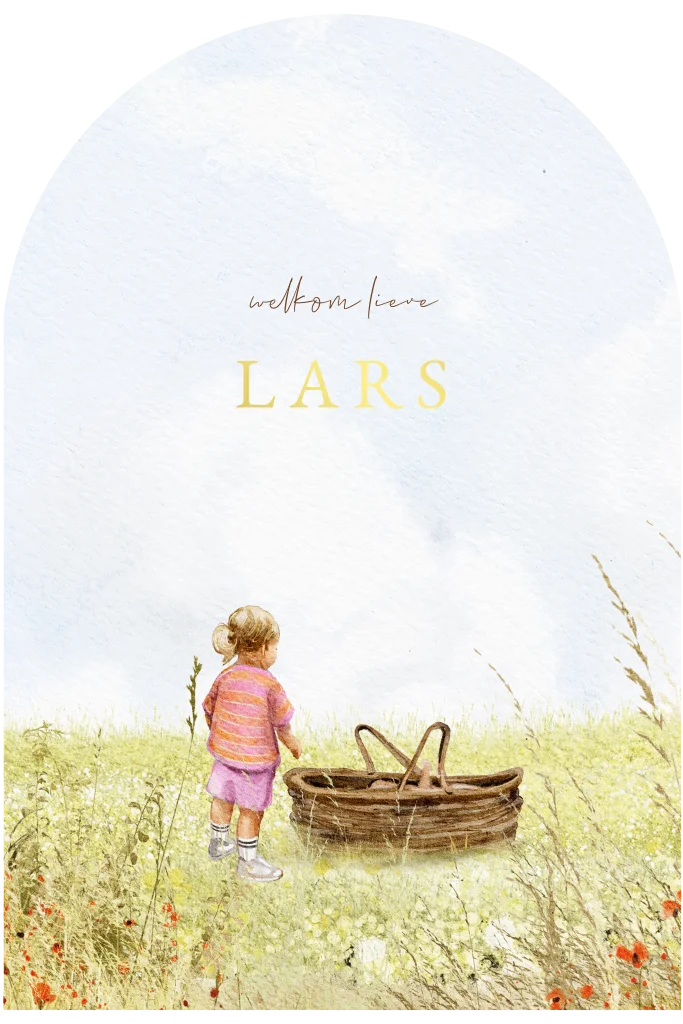 Dit lieve geboortekaartje heeft een handgeschilderde illustratie van een baby in een mandje, omringd door lente- of zomerbloemen en een zusje. Het zusje heeft een blond staartje en vrolijk gekleurde kleding aan. Je kunt het meisje ook vervangen door andere kindjes en of dieren. De boogvorm zorgt voor een speelse en elegante uitstraling.