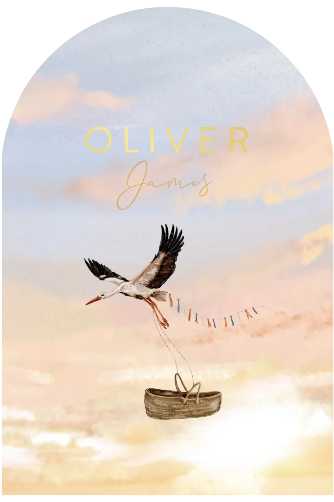 Geboortekaartje met zonsondergang in boogvorm met ooievaar