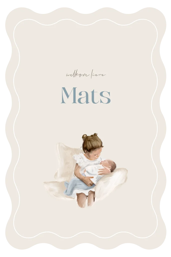 Op zoek naar een origineel geboortekaartje voor jullie zoontje? Dit christelijke geboortekaartje met een golvende rand en een schattige illustratie is perfect voor het aankondigen van de geboorte van jullie zoon. De zachte kleuren beige en blauw geven een warme en liefdevolle uitstraling aan het kaartje, waardoor het perfect past bij de komst van jullie kleine mannetje. Dit originele geboortekaartje is voorzien van een golvende stansvorm, wat zorgt voor een unieke en speelse uitstraling. De illustratie bevat een meisje met een baby op schoot, je kunt deze ook vervangen door andere kinderen. Vraag ons gerust even om hulp!