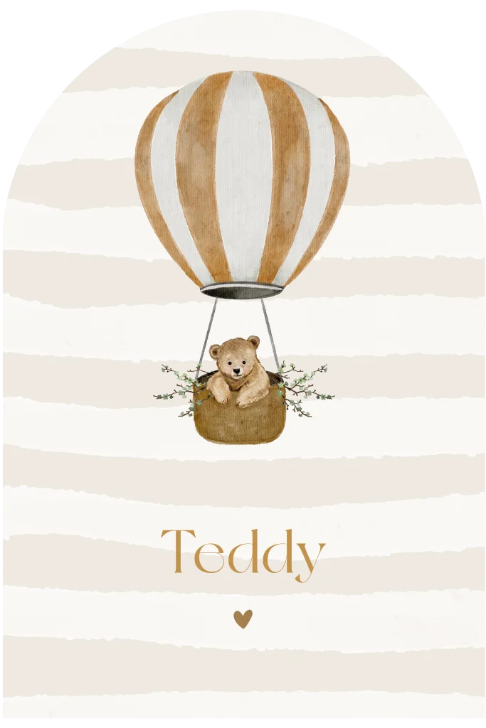 Geboortekaart in een boogvorm met beige strepen achtergrond. Op dit kaartje staat een illustratie van een luchtballon met een beer in een mandje. Door de neutrala kleuren is dit kaartje te gebruiken voor jongens en voor meisjes. Bewerk de kaart in onze editor en personaliseer met eigen illustraties en teksten.
