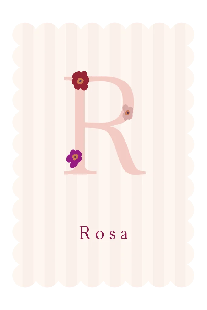 Op zoek naar een uniek geboortekaartje voor een dochter? Dan is de stansvormige schulprand kaart met de eerste letter van de naam van jullie kindje. Met een roze streep achtergrond en leuke fleurige bloemetjes. Je kunt de eerste letter van de naam zelf aanpassen, evenals de bloemetjes.
