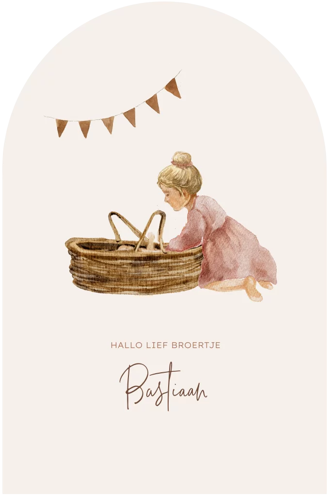 Geboortekaartje broertje in een boogvorm. Dit kaartje heeft een lieve illustratie van een grote zus met een roze jurk bij een baby in een mandje. Bovenaan hangen vrolijke slingers. Uniek geboortekaartje voor een tweede kind,