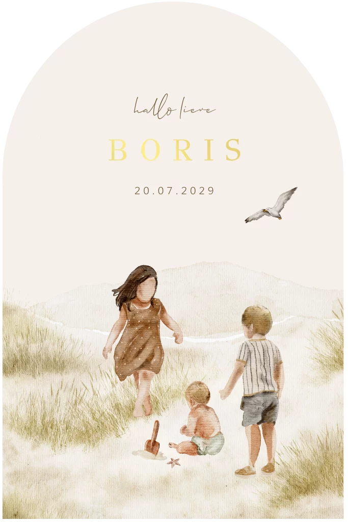 Geboortekaartje voor een klein broertje met handgetekende illustraties. Dit kaartje voor jullie zoon is voor een derde kind, maar je kunt de afbeeldingen ook aanpassen zodat het voor een tweede of eerste kind is. De duinen achtergrond maken dit tot een prachtig zomer geboortekaartje.
