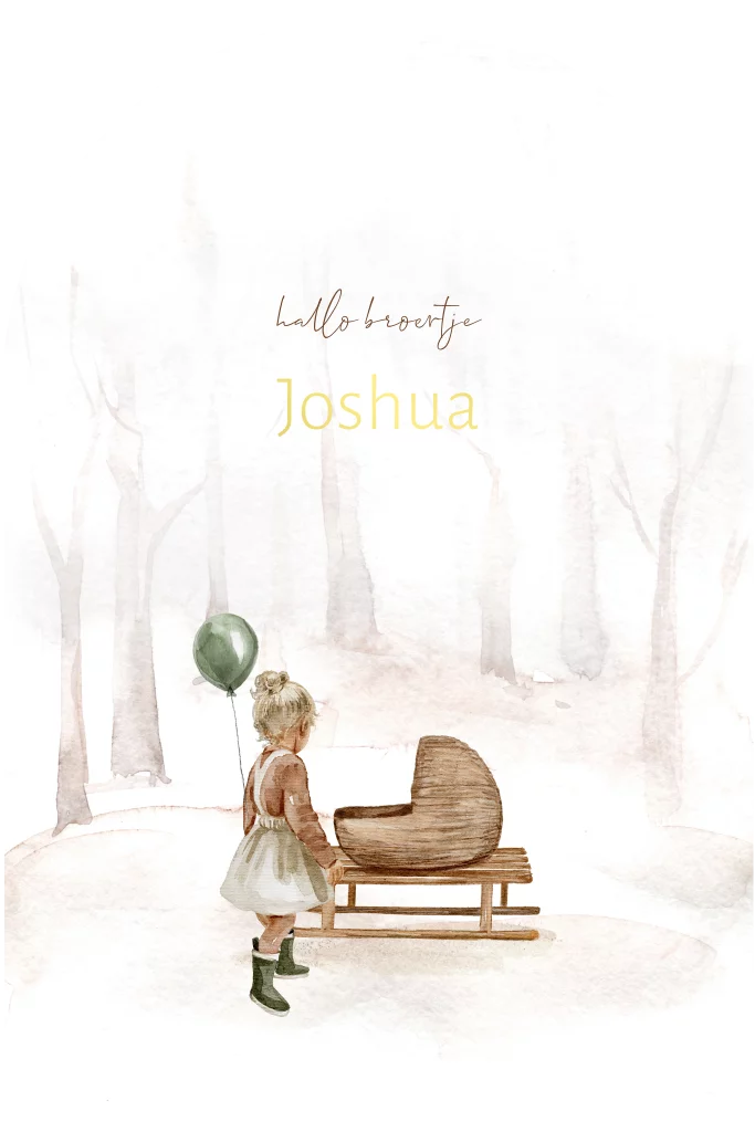 Lief winter geboortekaartje voor een broertje. Dit kaartje heeft een boogvorm en op de achtergrond een aquarel van een bos. Op de voorgrond staat een zus bij een slee met een wiegje. Uniek getekend geboortekaartje dat je zelf kunt bewerken en aanpassen.