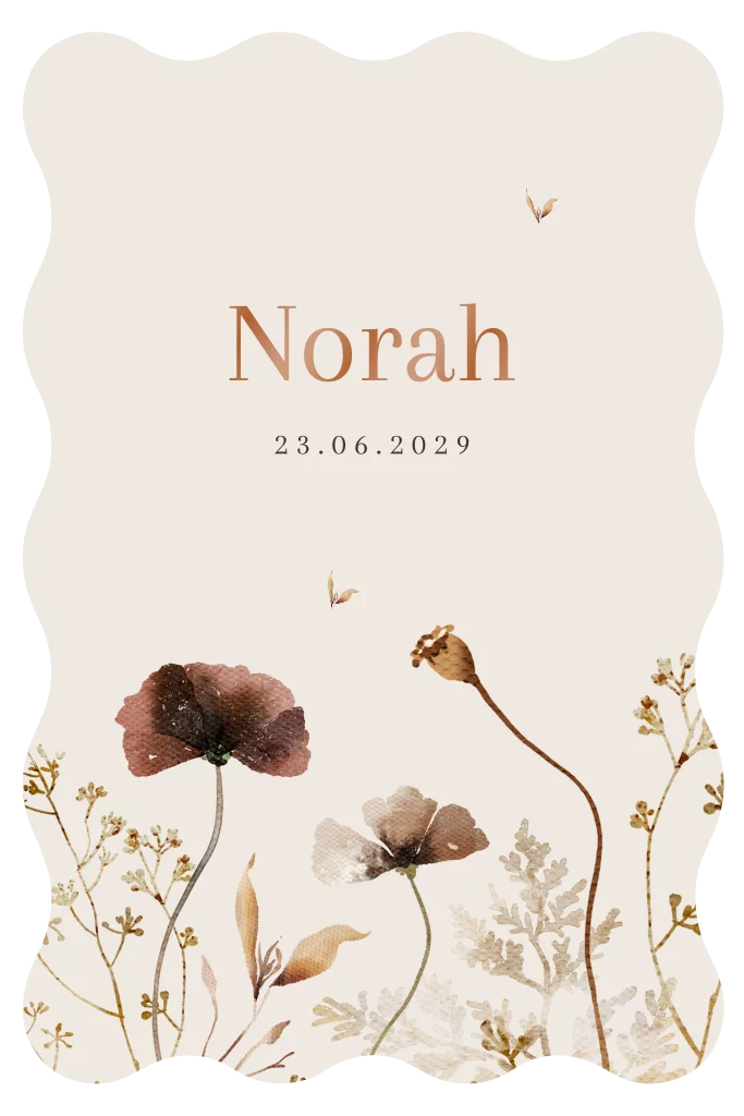 Welkom bij onze collectie geboortekaartjes, waar we trots zijn om dit prachtige geboortekaartje met een golvende rand en bloemen in roestbruine tinten te presenteren. Dit lieflijke kaartje is perfect voor de aankondiging van de geboorte van een meisje. De unieke vorm en de warme kleuren geven dit kaartje een bijzondere uitstraling die zeker de aandacht zal trekken. Met de toevoeging van bloemen in roestbruine tinten straalt dit geboortekaartje een gevoel van warmte, liefde en verbondenheid uit. De golvende rand voegt een speels en origineel element toe, waardoor dit kaartje perfect is voor ouders die op zoek zijn naar iets unieks en anders. Dit geboortekaartje is voorzien van luxe details, zoals hoogglans in koperkleur, waardoor het een vleugje elegantie en stijl toevoegt.