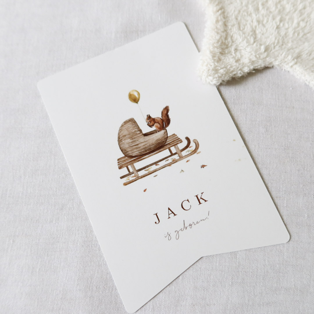 Geboortekaartje herfst bladeren eekhoorn ballon slee in originele vorm