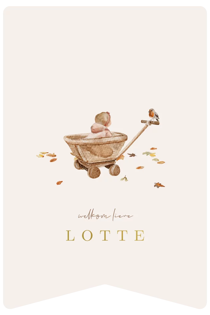 Een getekend geboortekaartje in een unieke vorm van een wimpel met een illustratie van een bolderkar en een meisje. Op de kar zit een roodborstje en op de grond liggen herfst bladeren. Vrolijk herfst geboortekaartje in originele wimpelvorm.