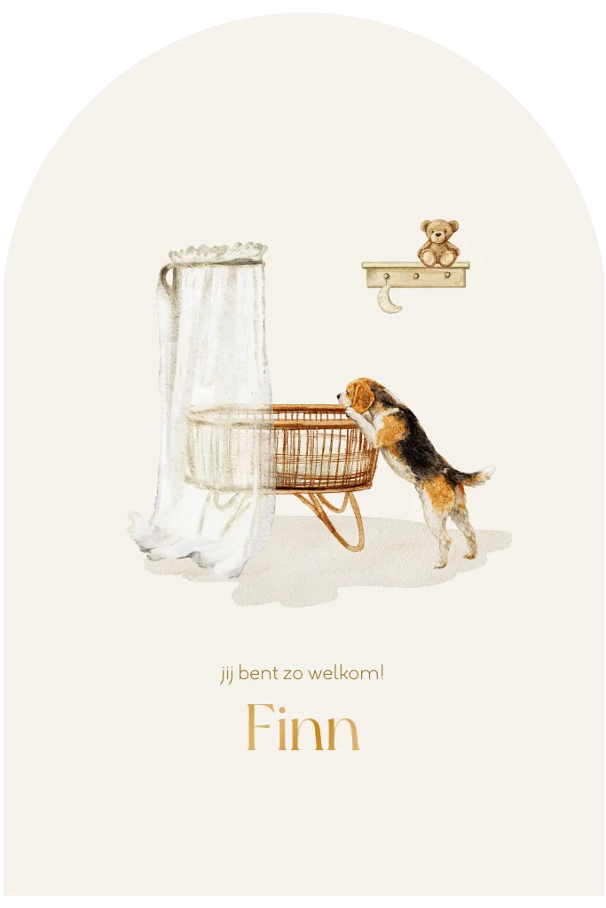 Huisdieren op je geboortekaartje zijn helemaal de trend van nu! Dit lieve geboortekaartje in boogvorm heeft een mooie aquarel illustratie van wiegje met een klamboe, Daarbij staat een beagle op zijn achterpootjes te kijken in de wieg. Geboortekaartjes met huisdieren zijn heel populair. Heb je een ander huisdier dan kan je de beagle vervangen in de editor. De naam wordt gedrukt in glanzend hoogglans.