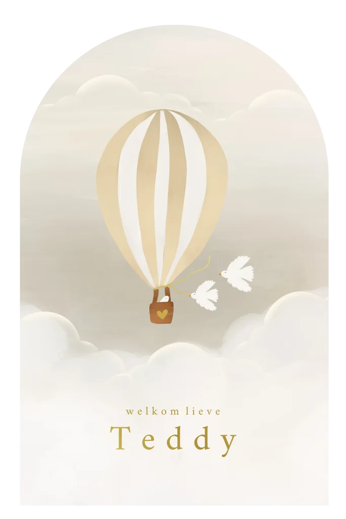 Een mooi uniek stans boog geboortekaartje. Helemaal in de wolken, met duifjes en een luchtballon. In beige en geel tinten en goudfolie. Tekst en kleur kunnen zelf gewijzigd worden. Formaat is ongeveer 10x16cm.