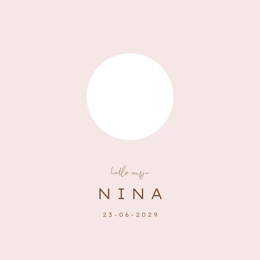 Dubbel geboortekaartje met een rondje voorop uitgestanst. Daar doorheen zie je een illustratie van een oudere zus bij een baby in een wiegje en roze slingers. Je kunt dit kaartje zelf bewerken en aanpassen.