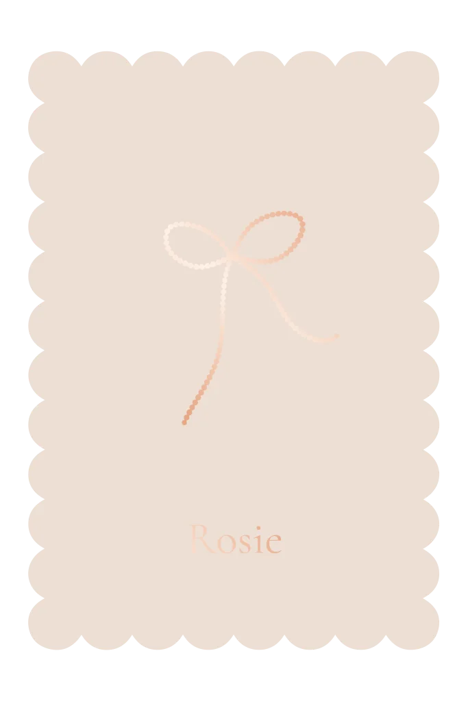 Een mooi geboortekaartje met een schulprand. Met een strikje in rose goudfolie. Kleuren kunnen naar wens gewijzigd worden.