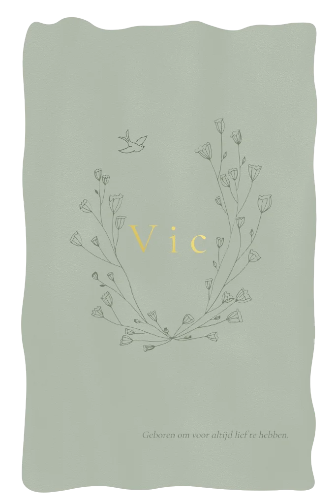 Een mooi minimalistische geboortekaartje met takjes en bloemen en een vogeltje. De kaart heeft een golvende rand.