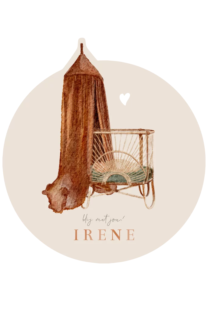 Stans geboortekaartje getekende wieg met klamboe roestbruin