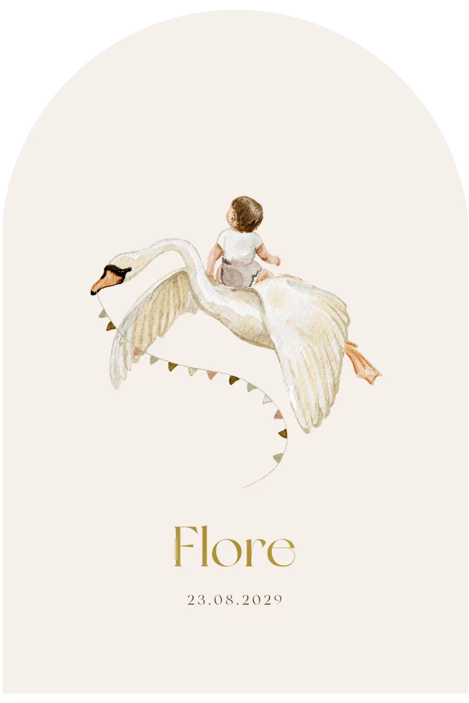 Op zoek naar een uniek geboortekaartje? Dit getekende geboortekaartje in boogvorm heeft een dromerige illustratie van een sierlijke zwaan. De zachte kleuren en sprookjesachtige uitstraling maken het perfect voor de geboorte van een meisje.