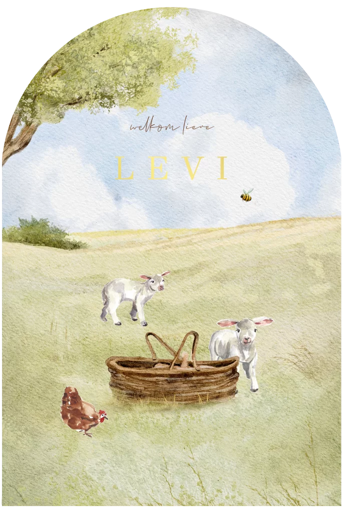 Uniek lente geboortekaartje in een mooie boogvorm. Op het kaartje staan lammetjes in een wei bij een baby in een mandje. Een vrolijk Hollandse lentekaartje. Alle illustraties op dit kaartje kan je zelf verwijderen of nieuwe toevoegen. Zo maak je een uniek kaartje voor jullie baby. De naam wordt gedrukt in goudfolie.