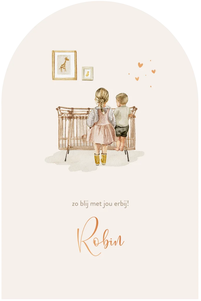 Neutraal geboortekaartje in een beige kleur. Op het kaartje staat een aquarel tekening van een ledikantje met een zusje en broertje er naast. De vorm van dit kaartje heeft een boog en de naam wordt gedrukt in koperfolie. Je kunt de illustraties op dit kaartje eenvoudig aanpassen in onze editor. Kaartje is unisex, dus te gebruiken voor jongens en meisjes.