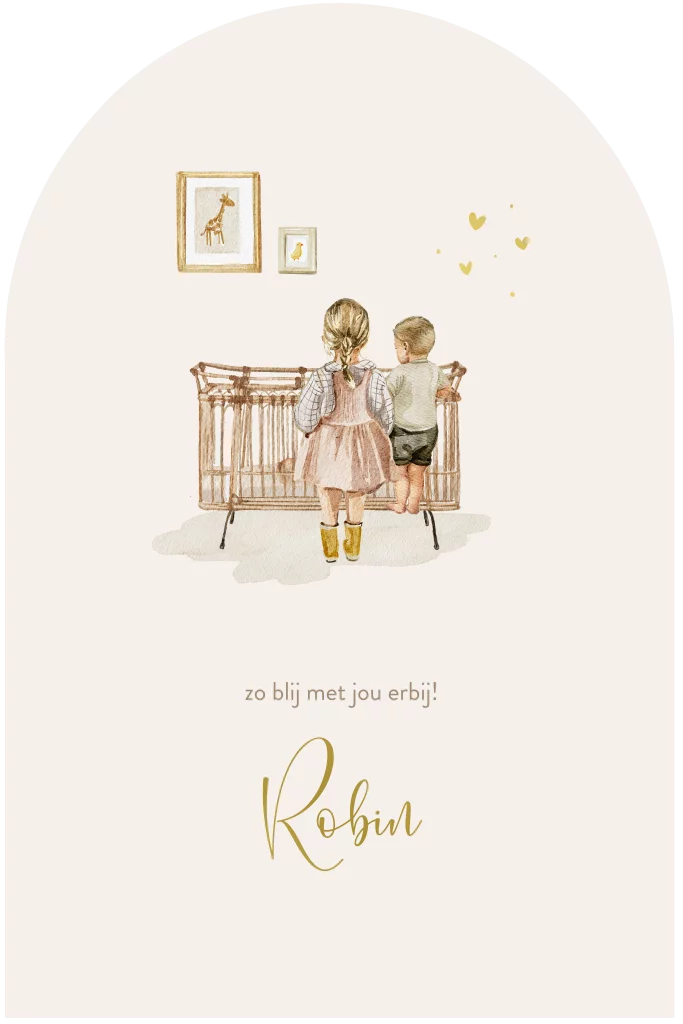 Neutraal geboortekaartje in een beige kleur. Op het kaartje staat een aquarel tekening van een ledikantje met een zusje en broertje er naast. De vorm van dit kaartje heeft een boog en de naam wordt gedrukt in koperfolie. Je kunt de illustraties op dit kaartje eenvoudig aanpassen in onze editor. Kaartje is unisex, dus te gebruiken voor jongens en meisjes. De naam wordt gedrukt in goudfolie.