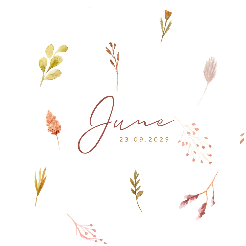Rond geboortekaartje met een achtergrond van droogbloemen. De bloemetjes hebben roze en oranje kleuren. Lief en bijzonder geboortekaartje voor een baby meisje. De ronde vorm maakt dit kaartje extra bijzonder voor jullie kleine meisje.