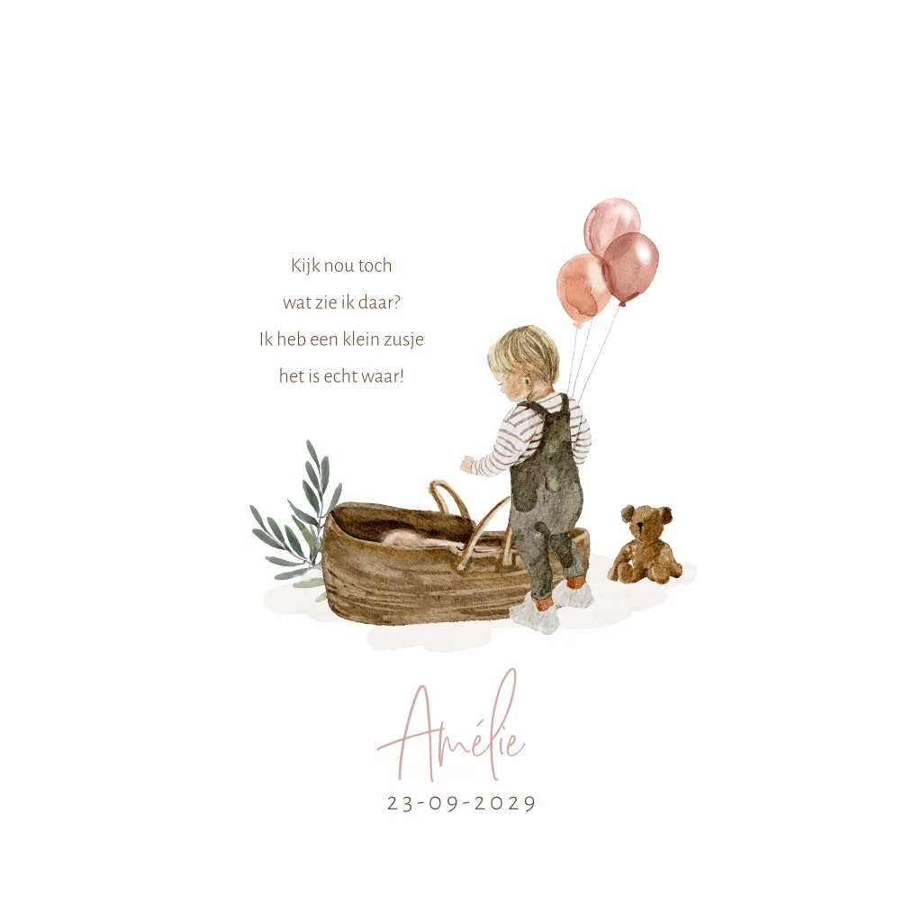 Lief geboortekaartje voor een zusje met een baby wiegje op de grond en een ouder broertje met roze ballonnen. Deze geboortekaart voor een tweede kindje is extra speciaal door de ronde vorm.