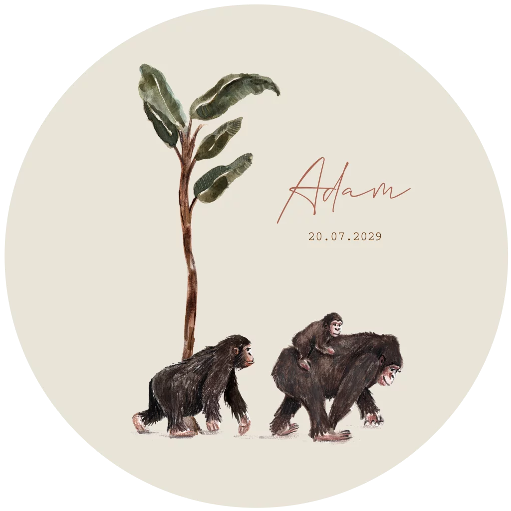 Rond geboortekaartje in een jungle thema. Op het kaartje staat een papa aap met een kleintje op zijn rug, en daarachter een mama aap. Uniek getekend geboortekaartje wat je zelf helemaal kunt bewerken.