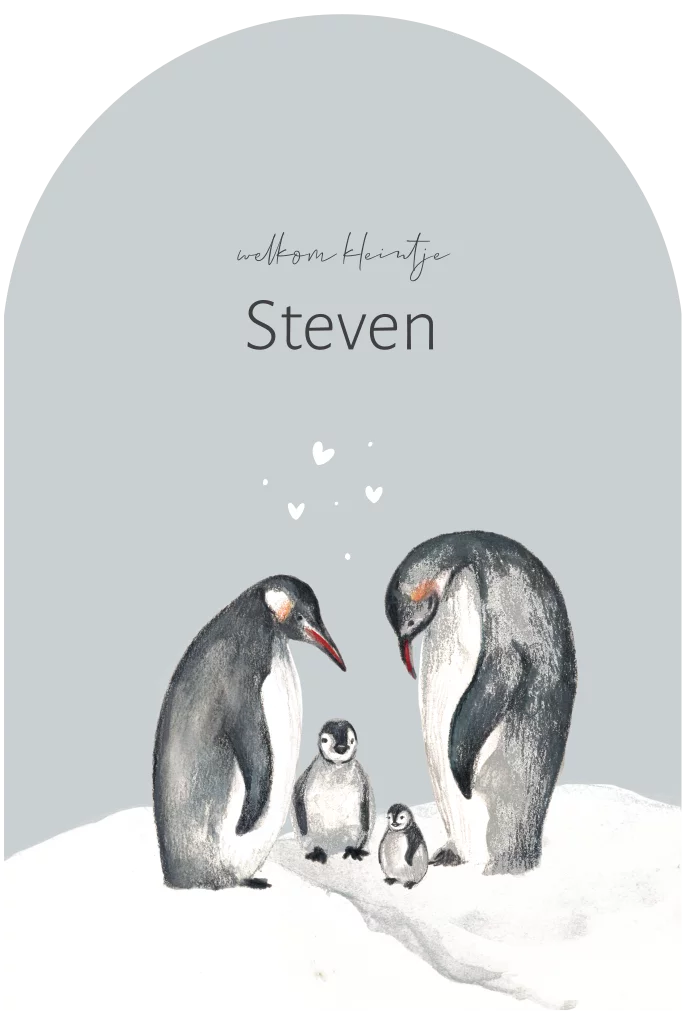 Lief winter geboortekaartje in arch vorm. De achtergrond is blauwgrijs en daarop staan een papa en mama pinguin met 2 kleintjes. Leuk geboortekaartje voor een tweede kindje.