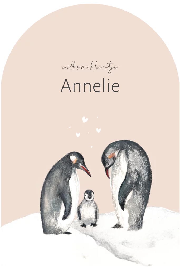 Winter geboortekaartje arch vorm roze met pinguins