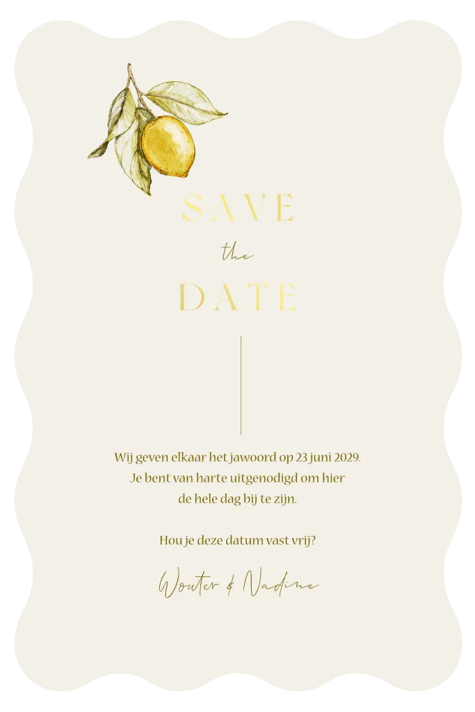 Prachtige save the date kaart met een illustratie van citroenen. Deze kaart heeft mooie golvende randen. De save the date tekst wordt gedrukt in glanzend goudfolie voor een extra chique effect. Je kunt de illustratie ook vervangen door een andere tekening of een trouwlocatie.