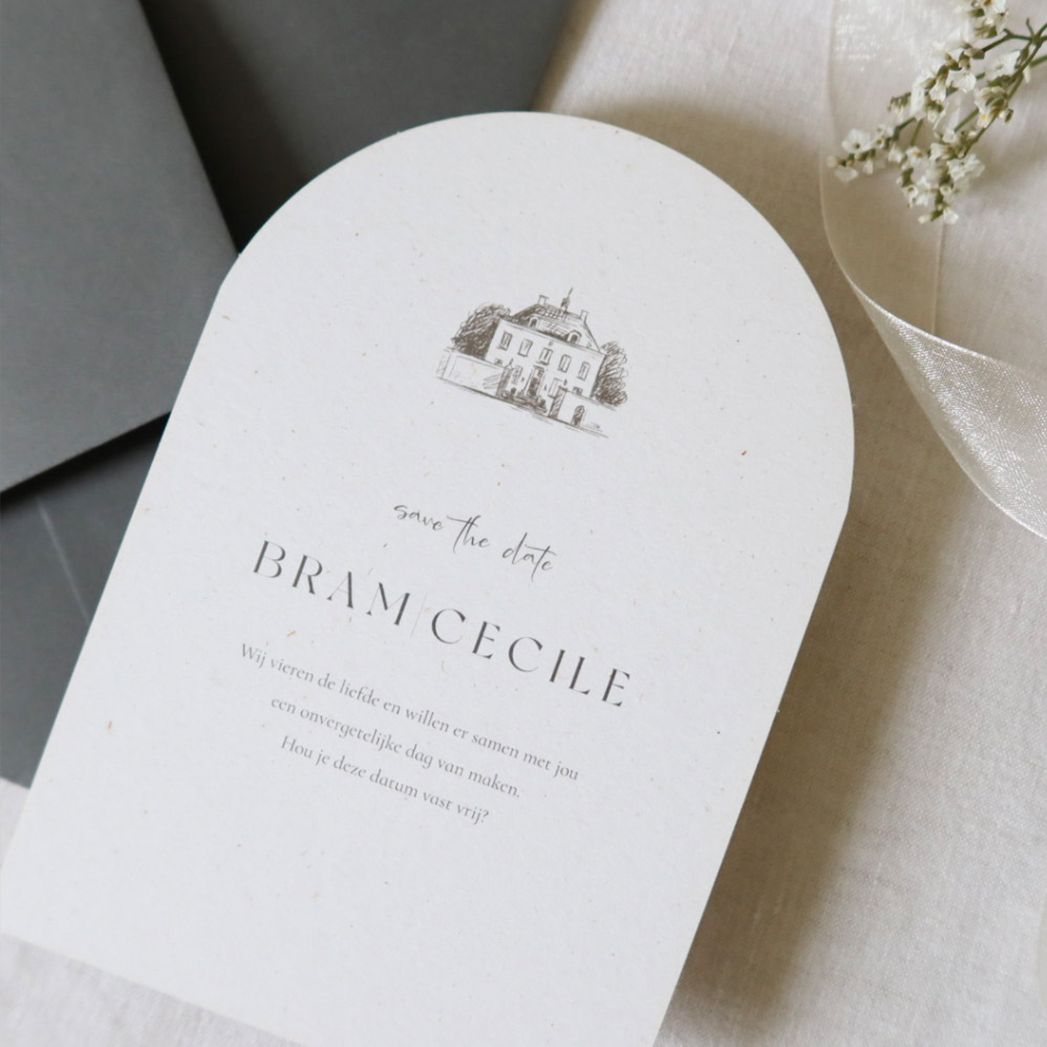 Op zoek naar een mooie Save the Date kaart? Bekijk dan deze kaart in een mooie boogvorm. Een klassieke kaart met een achtergrond van beige papier. Daarop een pentekening van een trouwlocatie, in dit geval het witte kasteel. We kunnen ook andere trouwlocaties tekenen in deze stijl, neem dan even contact met ons op.