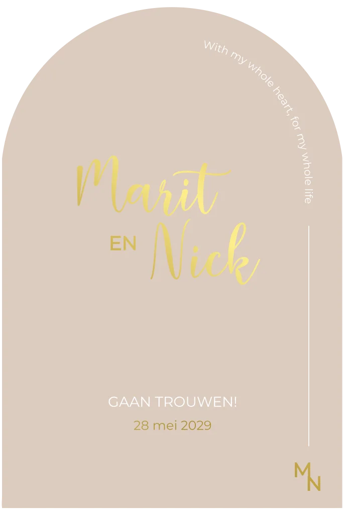 Beige klassieke trouwkaart in een mooie boogvorm. Aan de rand van deze bruiloft uitnodiging staat de tekst 'with my whole heart, for my whole life'. En onderaadn staan goudfolie initialen. Ook de namen worden gedrukt in folie. Liever een andere tekst, laat het ons dan even weten.