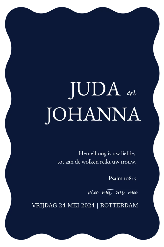 Prachtige trouwkaart met golvende randen. Dit geeft deze kaart een extra chique effect. De achtergrond is donkerblauw met daarop witte letters. Een mooie stijlvolle uitnodiging voor jullie bruiloft. Bewerk zelf alle teksten en bestel een proefdruk.