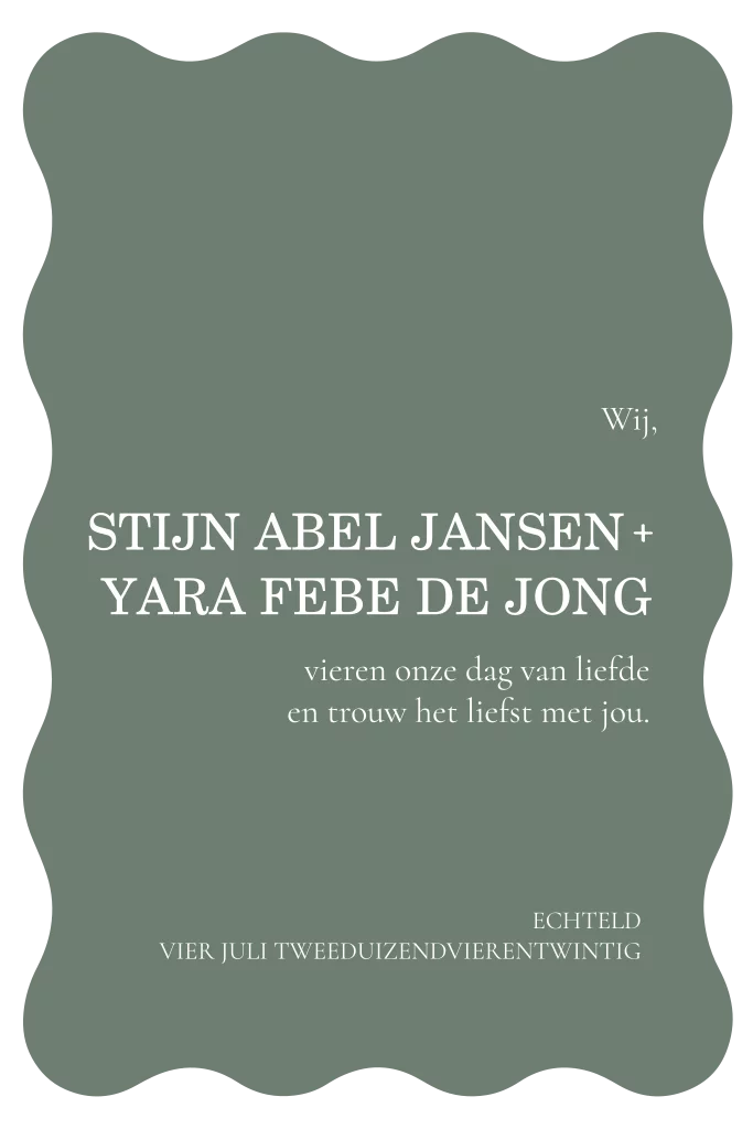 Op zoek naar een prachtige en originele trouwkaart voor jullie grote dag? Ontdek dan deze groene trouwkaart met een golvende rand. Achterop de kaart is voldoende ruimte voor alle belangrijke details van jullie bruiloft, zodat jullie gasten precies weten waar en wanneer ze jullie kunnen komen feliciteren. Deze unieke trouwkaart valt zeker op tussen de rest. De kleur groen geeft de kaart een frisse en natuurlijke uitstraling, perfect voor een bruiloft met een natuurthema of voor koppels die houden van de schoonheid van de natuur. De golvende rand zorgt voor een speels en origineel effect, wat deze kaart anders maakt dan de standaard trouwuitnodigingen. Het beste van alles is dat jullie deze trouwkaart helemaal zelf kunnen aanpassen en bewerken. Voeg jullie eigen tekst toe, pas de kleuren aan naar jullie wensen en maak de kaart helemaal eigen. Zo krijgen jullie de perfecte trouwkaart die helemaal past bij jullie stijl en persoonlijkheid. Met deze unieke kaart leggen jullie de basis voor een onvergetelijke bruiloft.