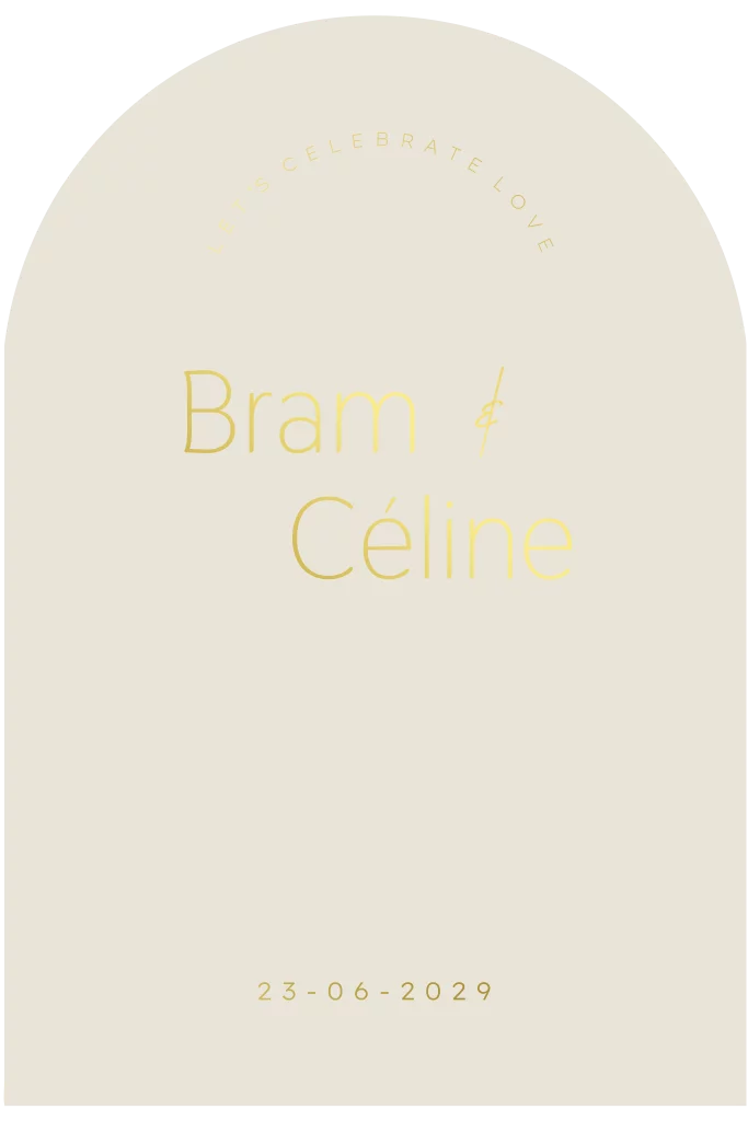 Deze stijlvolle beige kaart heeft een mooie boogvorm. De namen staan groot gedrukt in het midden van de kaart en wordt gedrukt in een goudfolie laklaag. Dat maakt deze minimalistische trouwkaart heel stijlvol.