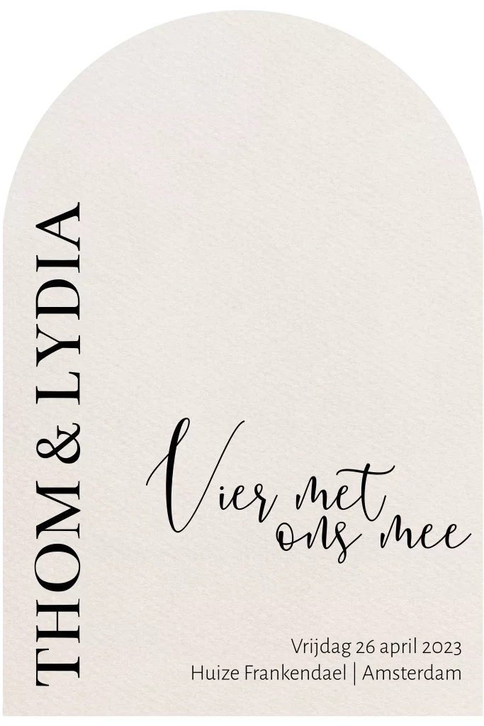 De mooiste save the date kaarten voor jullie bruiloft. Wanneer je van plan bent om te gaan trouwen, dan is het natuurlijk belangrijk om ook de perfecte uitnodiging te hebben. Bij Fientje & Co helpen we je graag om de mooiste kaarten te vinden die perfect bij jullie bruiloft passen. We hebben een ruim aanbod aan verschillende trouwkaarten, van klassiek tot exclusief. Zoals deze save the date kaart in een mooie boogvorm. Nodig je gasten uit met deze beige kaart die in de achtergrond een structuurtje heeft.